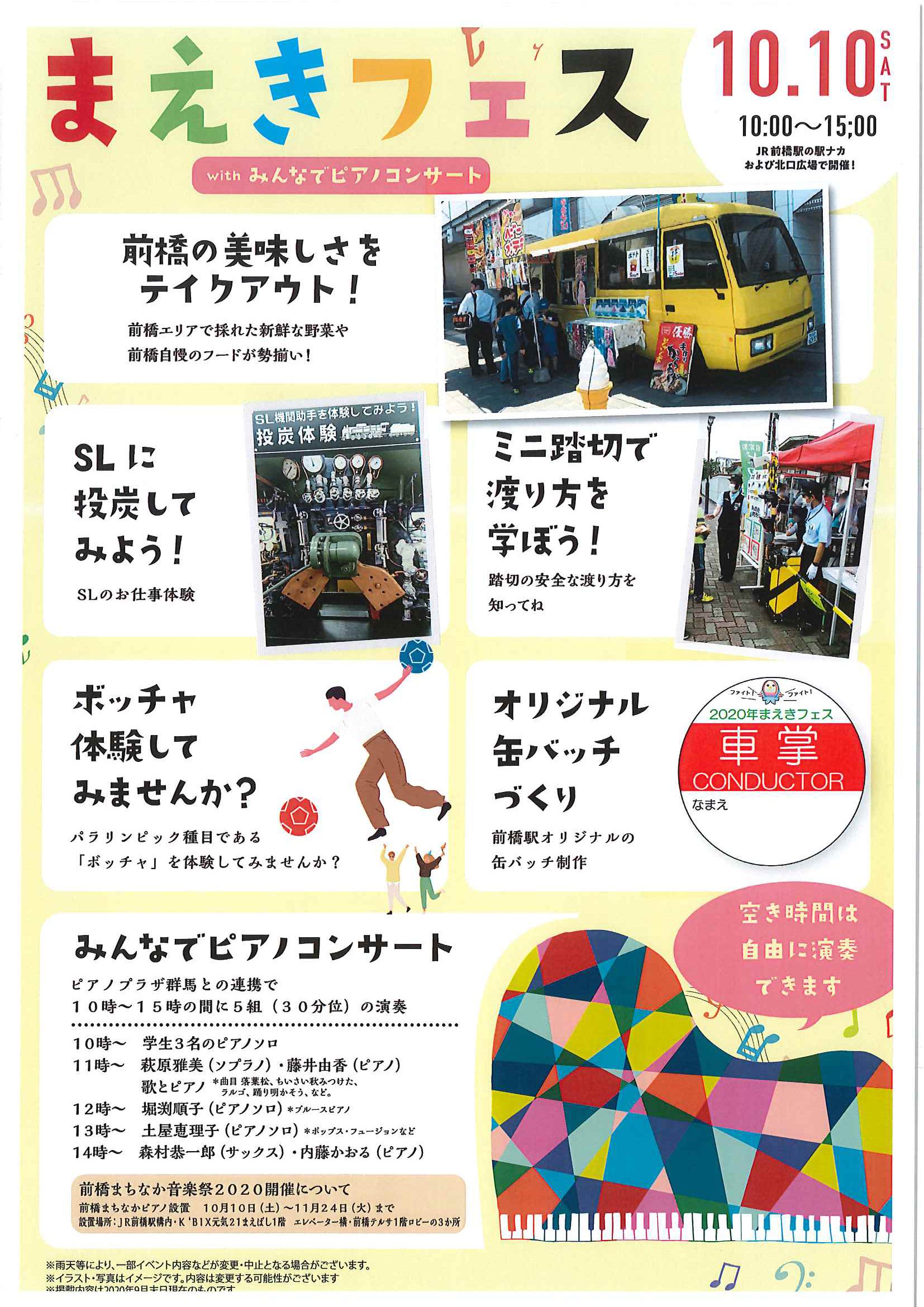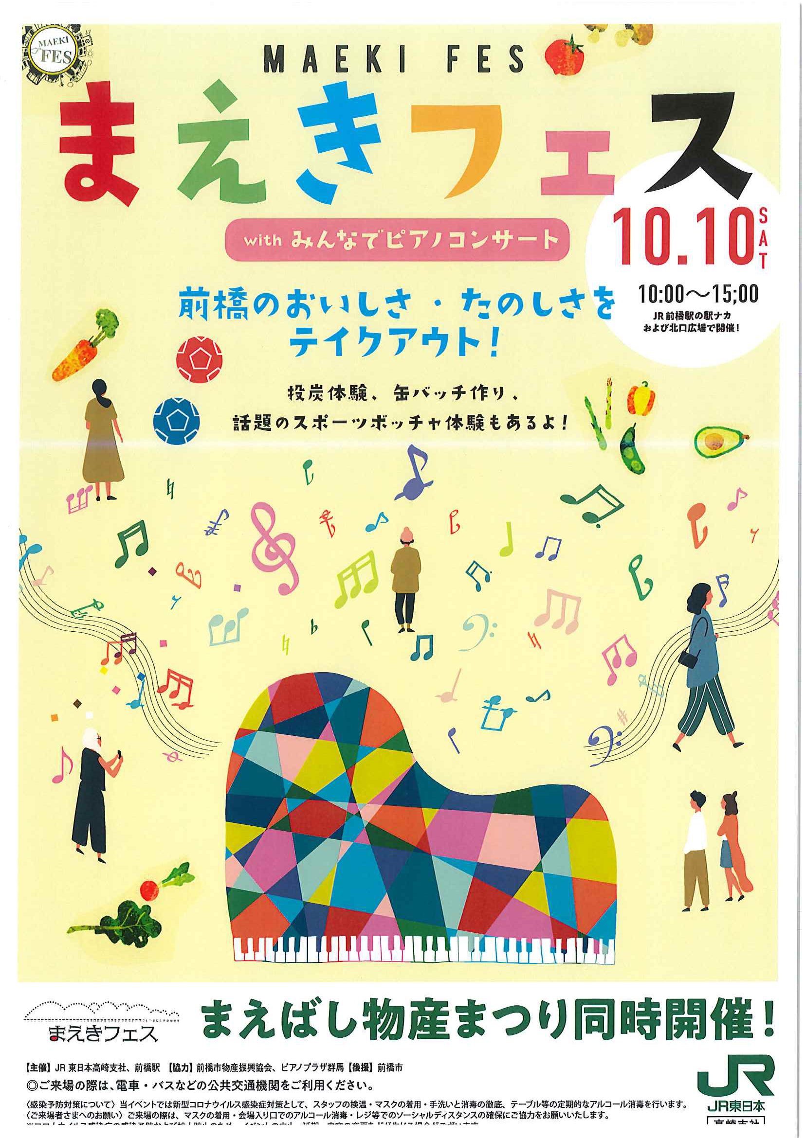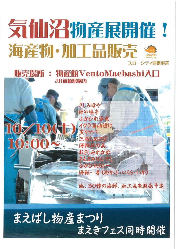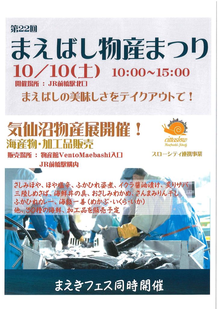 10月10日(日)10:00~15:00 JR前橋駅北口で、第22回まえばし物産まつりとまえきフェスの同時開催をします。今年の目玉は、前橋市と気仙沼市のスローシティ連携事業として、まえばし物産まつりの開催に合わせ、気仙沼市物産振興協会が物産館ヴェントマエバシ店内に気仙沼市特設コーナーを設け、海鮮など海の幸の販売をしてくれます。