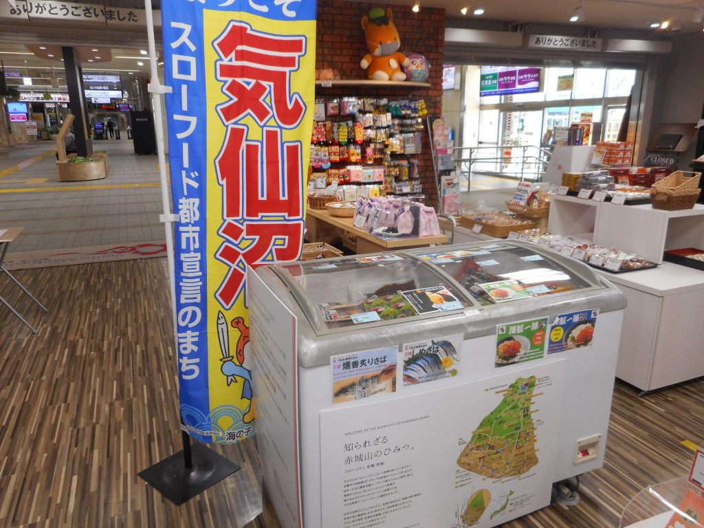このことから、相互の物産振興協会が連携し、市民の多くの方が利用されるJR前橋駅構内にある前橋物産館Vento Maebashiで気仙沼市を代表する特産品や物産品等を販売し、スローシティ活動のPRも行っています。