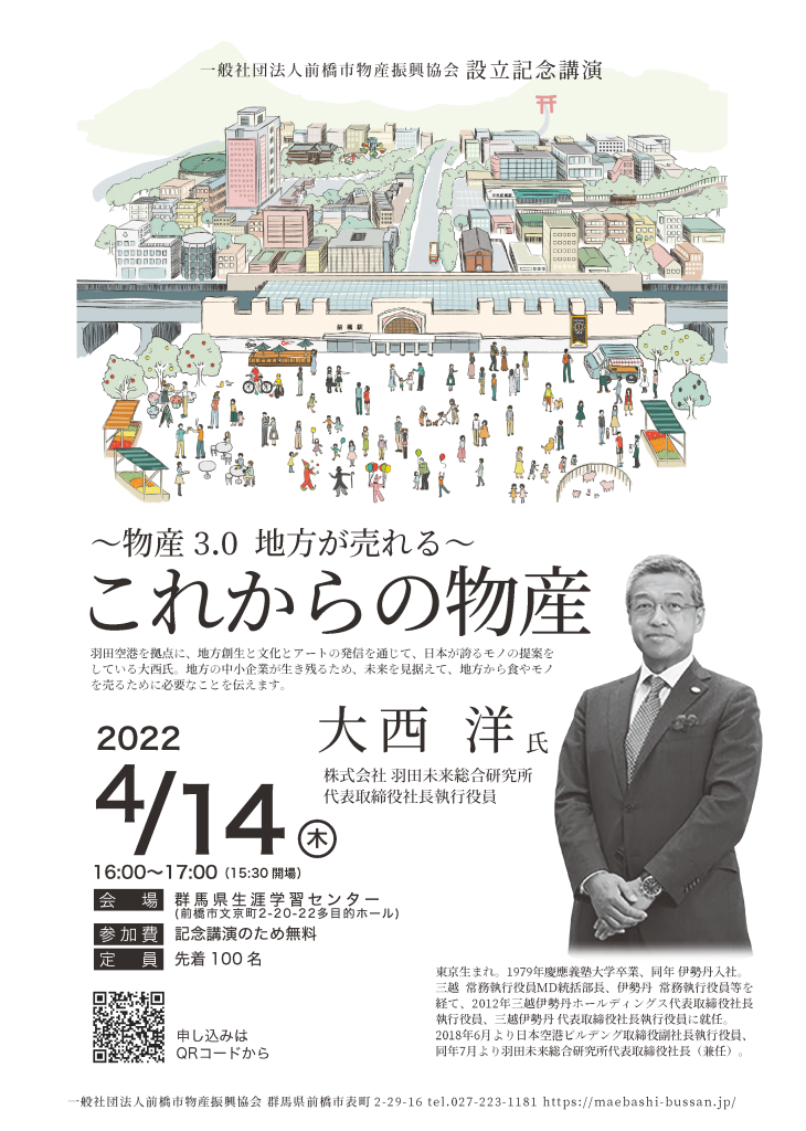 当協会が4月より『一般社団法人 前橋市物産振興協会』となります。それを記念いたしまして、百貨店業界のカリスマであった大西洋氏が、~物産3.0地方が売れる~ これからの物産をテーマに講演してくださいます。
