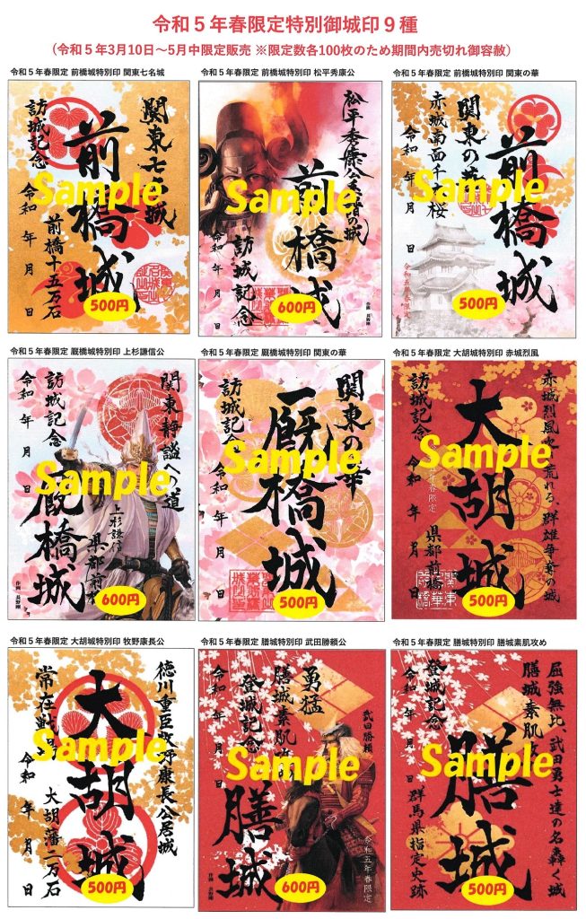 昨年度に続き桜をデザインした令和5年春限定版の特別御城印9種を発売します。前橋城3種、厩橋城2種、大胡城2種、膳城2種を一挙に販売します。いづれも各100枚の限定発売です。